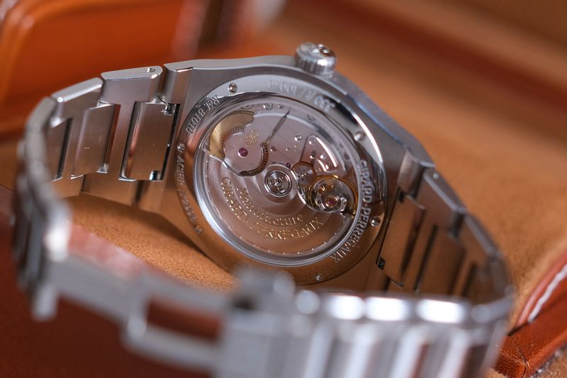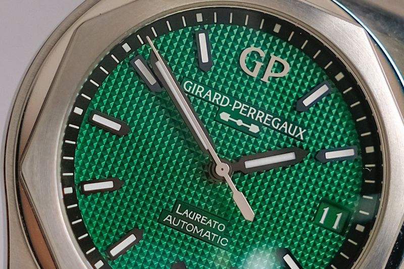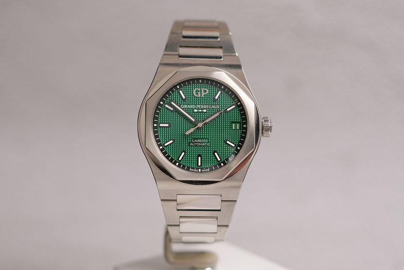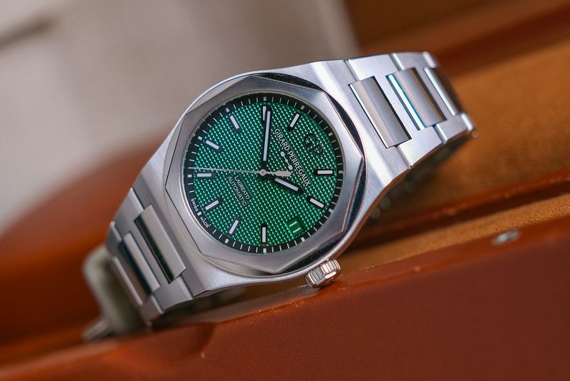 ขนาด 42mm. สวยมากๆ หน้าปัด Green Dial แกะ Clous de Paris สปอร์ต ดีไซน์เป็นเอกลักษณ์ของ Gerald Genta ที่ออกแบบให้ AP และ PP มีช่องบอกวันที่ เครื่อง Automatic GP01800 กระจก Sapphire หลังเปลือยเห็นเครื่องขัดลายสวยๆ มาพร้อมสายเหล็ก เป็นรุ่นฮิตของ GP เลยครับ