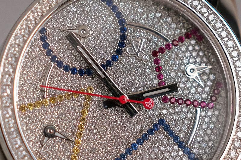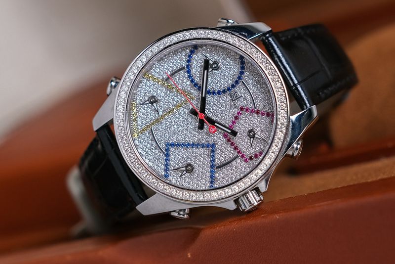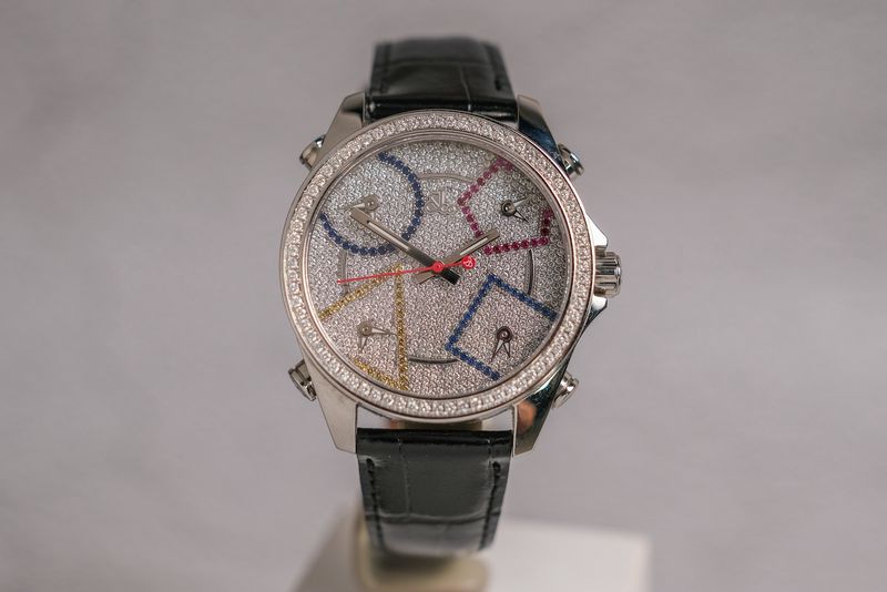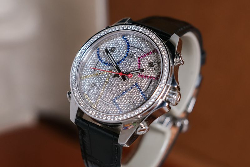 ขนาด 40mm. หน้าปัด Full Diamond Pave Dial ระยิบระยับสุดๆ ล้อมด้วยเพชรหรูหรา มาพร้อมฟังก์ชัน 5 Timezone บอกเวลาแยก 5 ประเทศ สามารถตั้งเวลาแยกได้ โดยแต่ละประเทศหน้าปัดจะมีสีสันและดีไซน์ที่แตกต่างกันไป ขอบฝังเพชร Original ตัวเรือน Steel เงาวาว ได้กลไก Quartz เดินดีเดินตรงไม่มีปัญหา