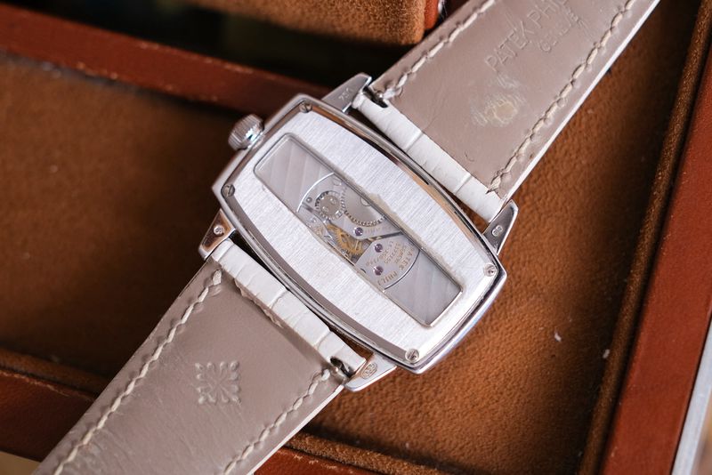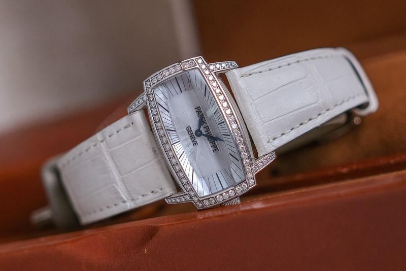 ขนาด 37×22 mm. หน้าปัดไข่มุก Mother of Pearl แกะลาย Guilloche สะท้อนแสงสวยงามทุกมุมมอง ตัวเรือน 18k White Gold ขอบเพชร Original งานละเอียดเนียนๆ ใส่สวย แปลกใหม่มีเอกลักษณ์มากๆครับ หลังเปลือยเห็นกลไกไขลานสวยงาม