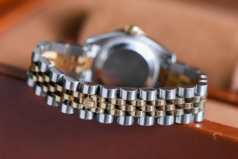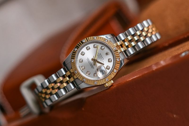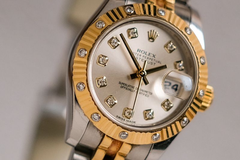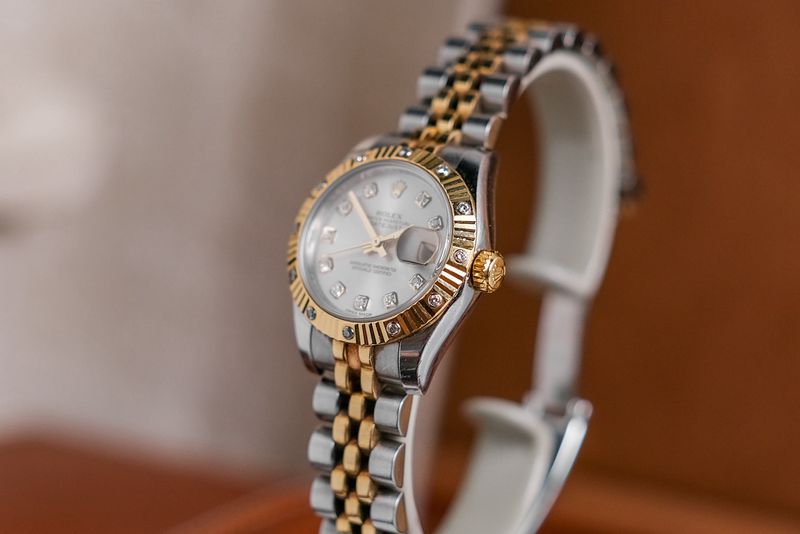 ขนาด 26 mm หน้าปัด Silver Sunburst Dial ตัดกับหลักทองคำฝังเพชร ตัวเรือน 2 กษัตริย์ Steel & 18K Gold สาย Jubilee ไฮไลท์คือได้ขอบหยักทองคำและฝังเพชร Original ด้วยครับ หรูมากๆ ขอบนี้หายากครับ