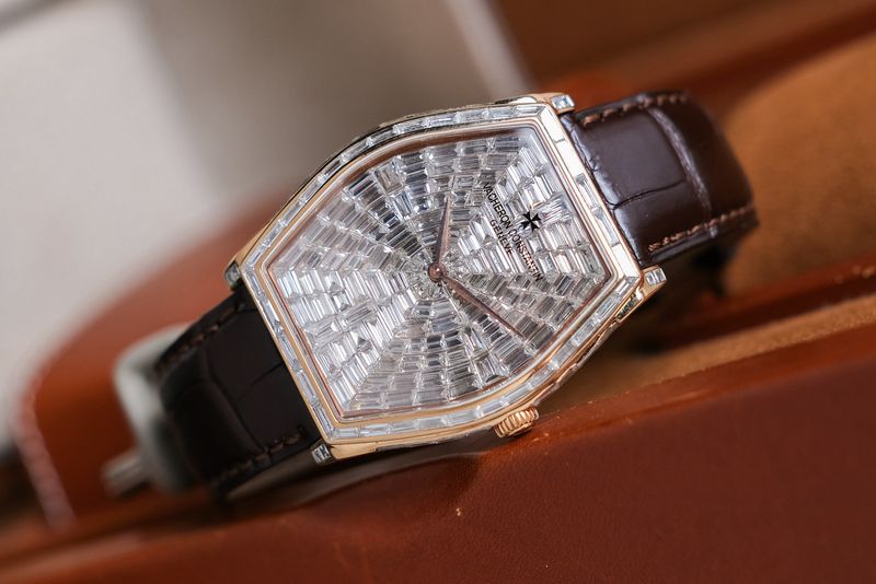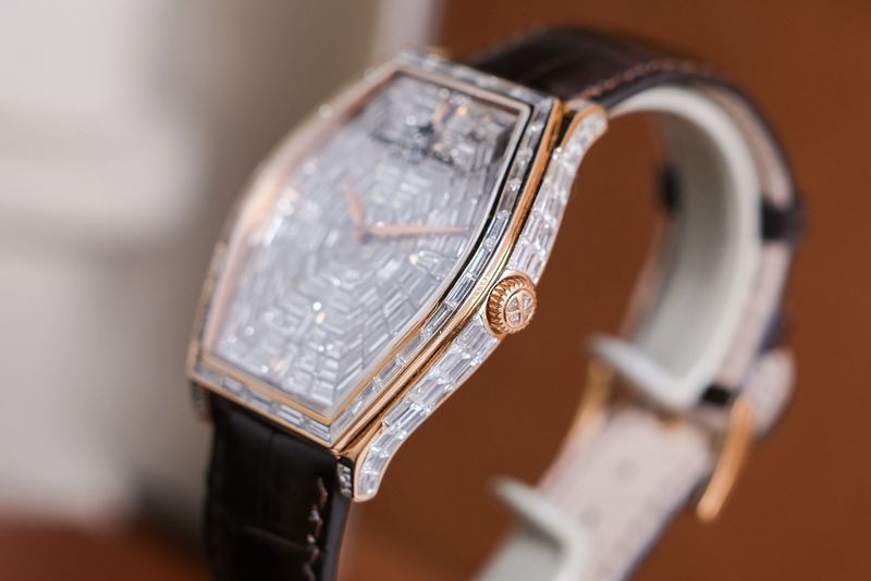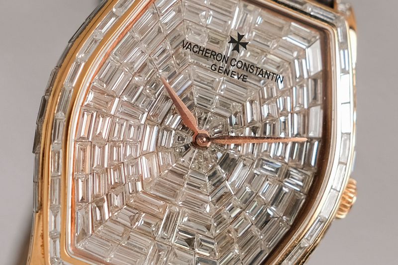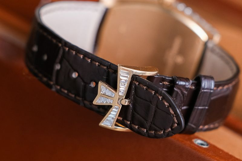 ขนาด 38 x 47 มม หน้าปัด Full Diamond Dial ฝังเพชรบาเกตทั้งหน้า ระยิบระยับสุดๆ เข็มทองคำทรงดาบใหญ่ ตัวเรือนทรงเอกลักษณ์ วัสดุทองคำ 18K Rose Gold ฝังเพชรบาเก็ต After Setting หลังทึบทองคำหนักๆ กลไกไขลาน สวยงามหรูหรา เป็น VC ที่หายากครับ