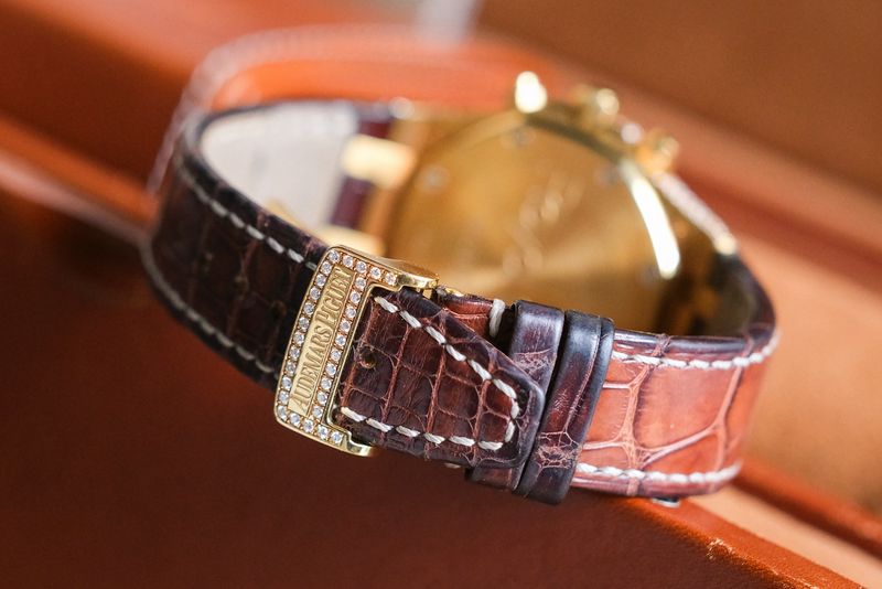 สวยทุกมุมมอง หน้าปัด Golden Diamond Paved Dial. วง Sub Dial ทำจากไข่มุข ตัวเรือนทองคำ 18K Gold ฝังเพชร After Setting ทั้งเรือน ระยิบระยับเล่นแสงมากๆ สวยไร้ริ้วรอยหนัก งานละเอียดเนียนๆ ขนาด 42mm. เครื่อง AP in house Automatic Chronograph ขัดลาย Cote de geneve งามๆ เดินดีตามมาตรฐานใส่ได้ทุกวัน