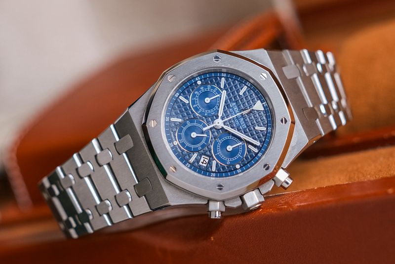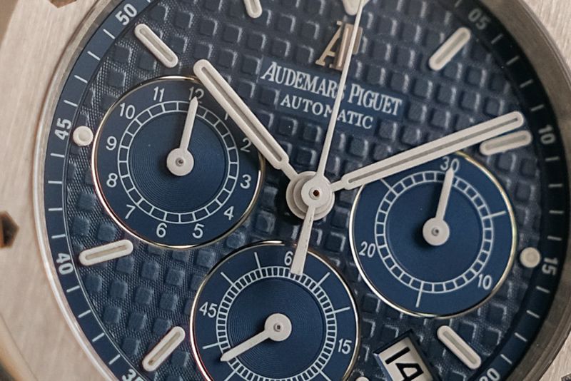 ขนาด 39mm. ใส่สวยกำลังดี หน้าปัด Blue Dial แกะลายวาฟเฟิลสีขาวสวยงาม มาพร้อมฟังก์ชันจับเวลา Chronograph ตัวเรือน Steel เหลี่ยมมุมคมทั่วทั้งเรือนตามสไตล์ AP ใส่สวยงามแบบ Sport Luxury มากๆครับ