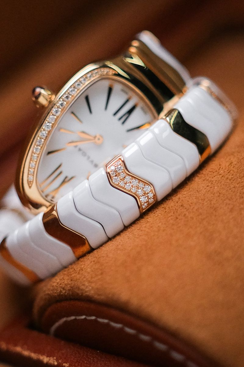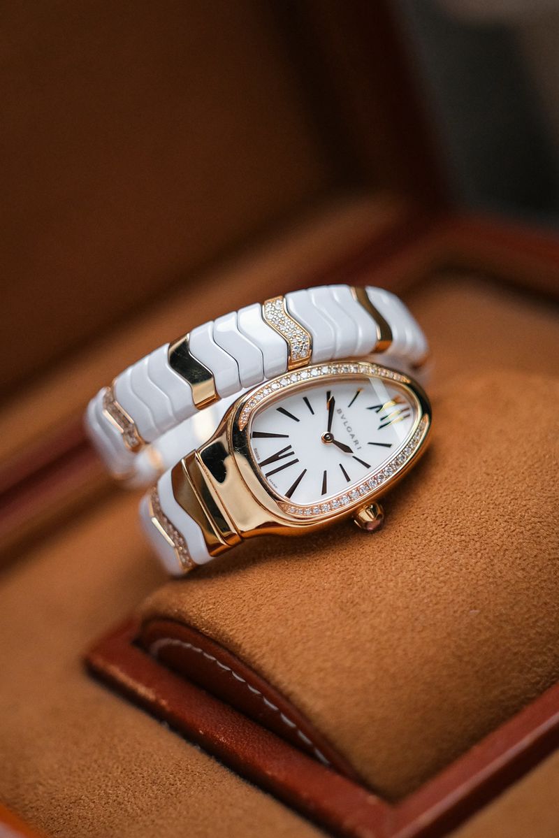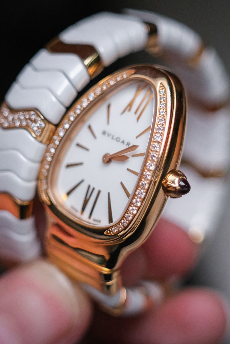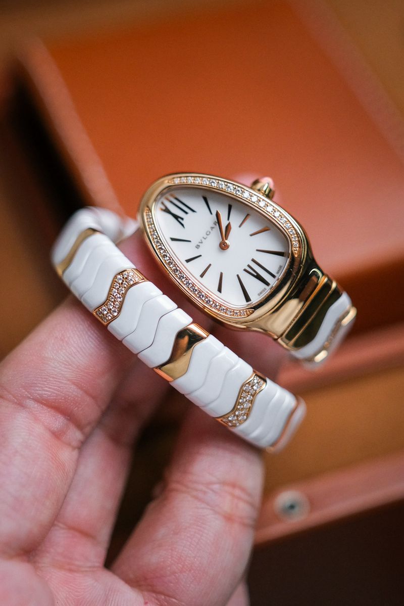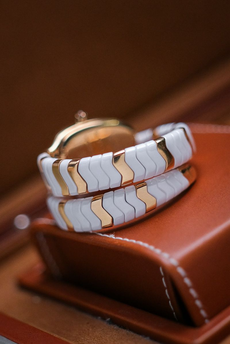 เรือนงูในตำนานของ Bulgari ที่โดดเด่นด้วยดีไซน์ Spiga ลายกำไลพันข้อมือสุดไอคอนิก ตัวเรือนทำจาก 18K Pink Gold ผสาน White Ceramic อย่างลงตัว หน้าปัดสีขาวสะอาดตา ประดับหลักชั่วโมง Roman Numerals พร้อมเม็ดมะยมฝังอัญมณีสีแดงอันเป็นเอกลักษณ์ ขับเคลื่อนด้วยระบบ Quartz ใช้งานง่าย เหมาะทั้งใส่จริงและสะสม ขนาดตัวเรือนประมาณ 35mm ให้ลุคหรูหราแต่ร่วมสมัย