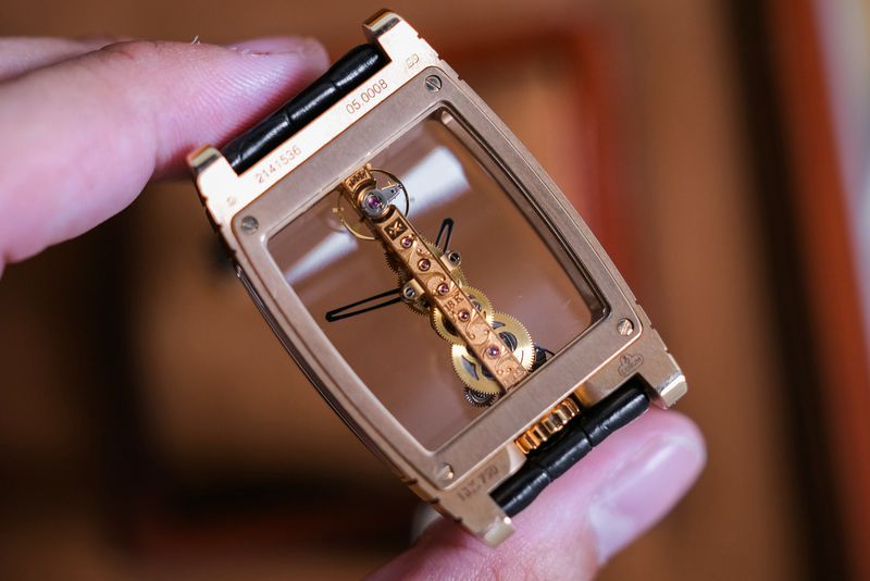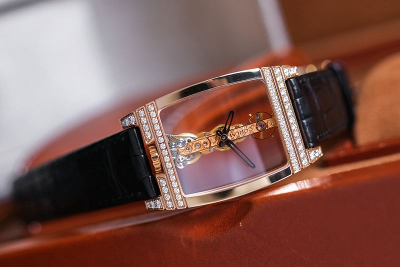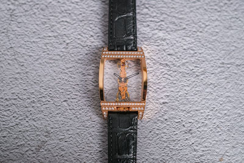 ขนาด 32 x 50มม.(รวมขา) ตัวเรือน 18k Rose Gold สวยงาม ด้านบนฝังเพชร Originals ระยิบระยับ สวยงามไม่มีที่ติ ข้างตัวถังเป็นกระจก Sapphire ทั้ง2ข้างโชว์เครื่องจักรกลไกทุกมุม เครื่องไขลานฟันเฟืองมากมายที่ถูกซ่อนอยู่ภายใต้สะพานเรียงเป็นแนวยาวอันเป็นเอกลักษณ์ของรุ่น เดินดีตามมาตรฐานนาฬิกาชั้นสูง