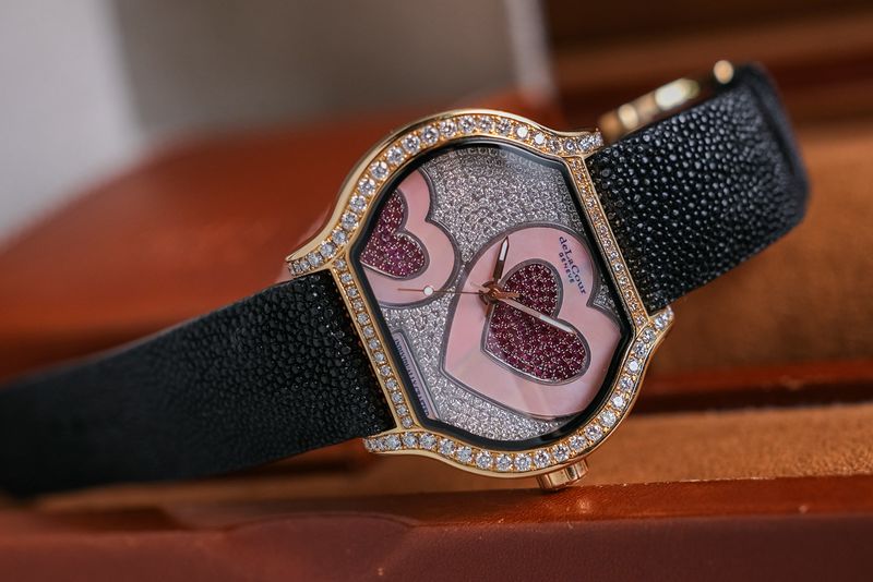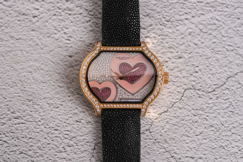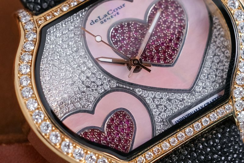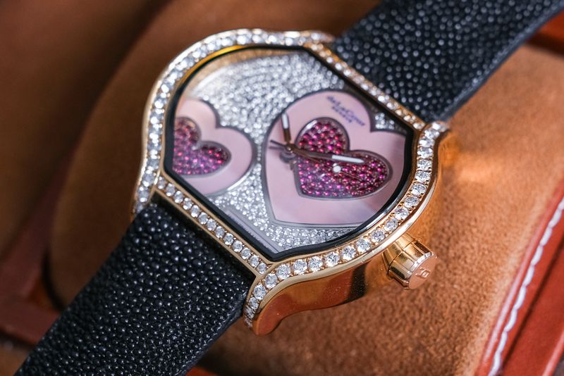 ขนาด 43.5 x 32 mm หน้าปัดฝังเพชรปูพรม ฝังเป็นรูปหัวใจสีแดงสด 2 ดวง ล้อมด้วยไข่มุกสีชมพู ตัวเรือนทรงแปลกตาใช้ทองคำ 18K Rose Gold หนักๆตันๆ หลังเปลือยเห็นกลไก Automatic เรือนนี้ผลิตเพียง 22 เรือนครับ แถมเลขสวยสุดๆ 02/22 ครับ