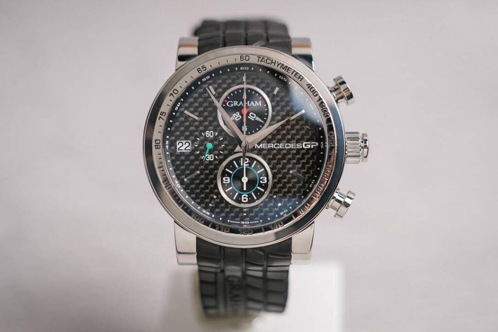 ขนาด 48mm หน้าปัด Carbon Fiber ทรงสปอร์ต ตัดกับเข็มสีเขียว Petronas Green มาพร้อมช่องวันที่และระบบจับเวลา ตัวเรือน Steel กลมสวย ขัดเงาสลับด้าน หลังเปลือยเห็นกลไก Automatic สกรีน Mercedes GP Petronas Formula 1 Team