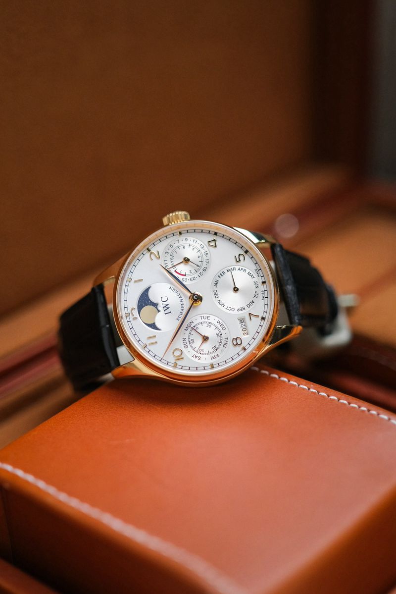 Perpetual Calendar ตัวท็อปจาก IWC Schaffhausen ดีไซน์คลาสสิกหน้าขาวเข็มทอง Rose Gold 44mm มาพร้อมฟังก์ชันครบ Day-Date-Month-Year + Moonphase อันเป็นเอกลักษณ์ อ่านค่าง่ายตามสไตล์ Portugieser ใช้เครื่อง In-house Cal. 52610 (7 Days Power Reserve) ระดับ Haute Horology ใส่ได้ทั้งทางการและสะสม ตัวเรือนทองคำแท้จับคู่สายหนังจระเข้สวยมาก