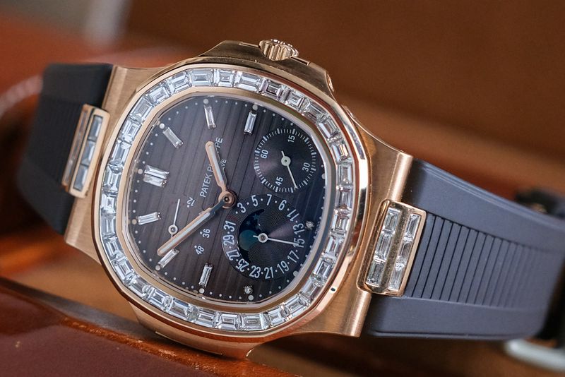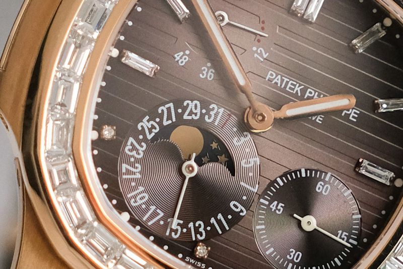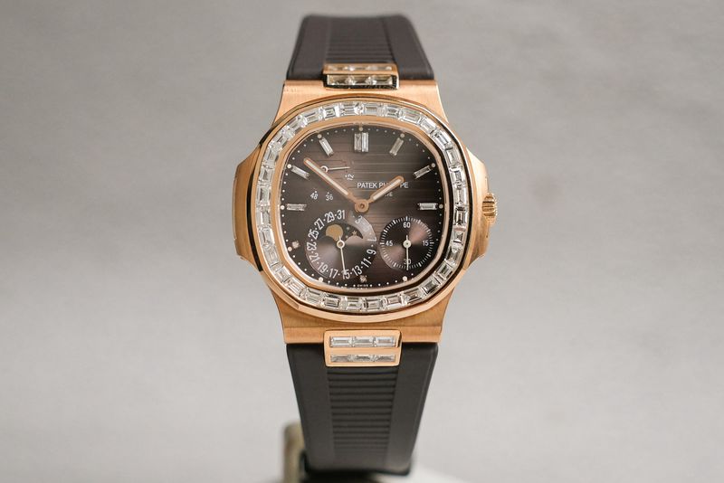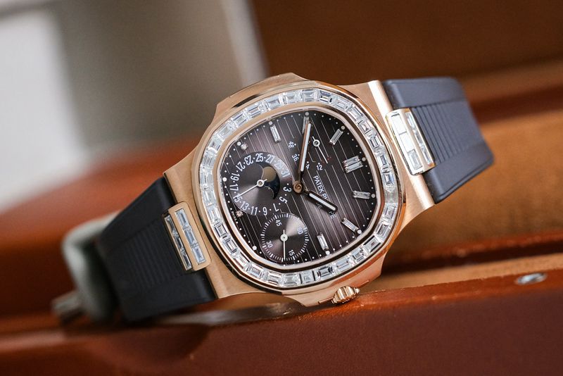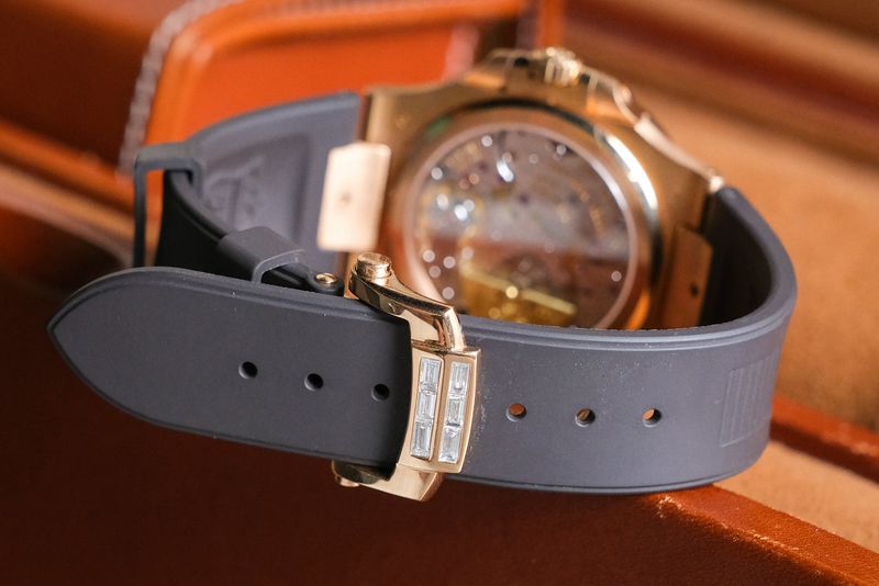 ขนาด 40mm. หน้าปัด Grey Dial สีเทาอมน้าตาล พร้อมฟังก์ชันเต็มหน้าปัด หลักและขอบฝังเพชรเม็ดใหญ่ After Setting ตัวเรือนทองคำ 18K Rose Gold หลังเปลือยเห็นเครื่อง Micro Rotor สวยงาม สายยาง Hanstitch คุณภาพสูง ใช้งานยาวๆสวยงาม เรือนนี้ฝังเพชรมาให้เหมือนตัว 5724R แต่ราคาดีกว่าเยอะครับ