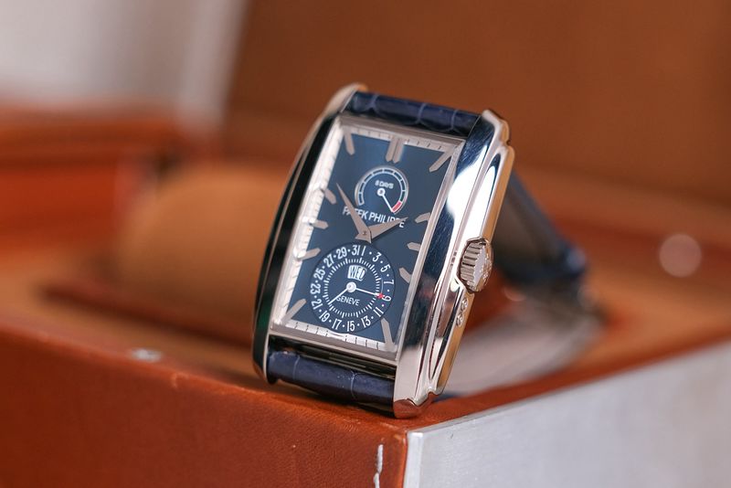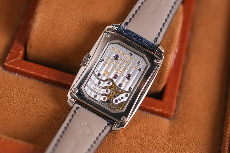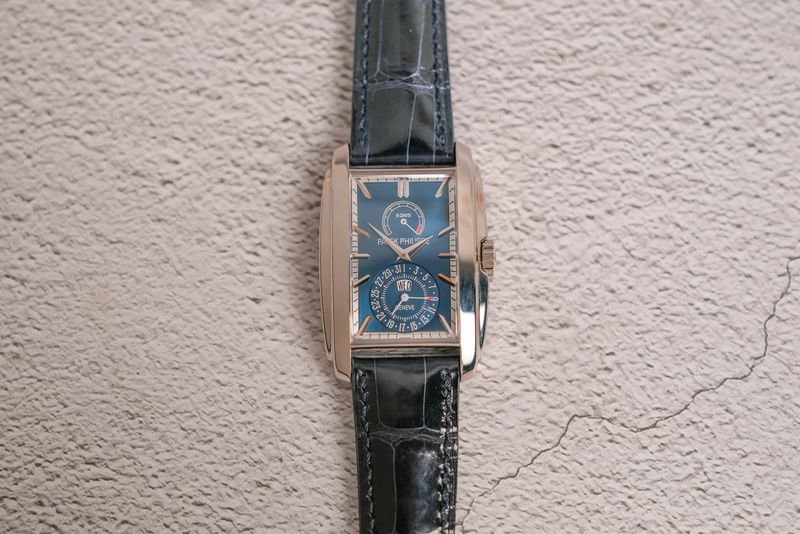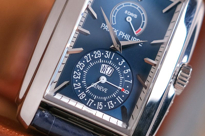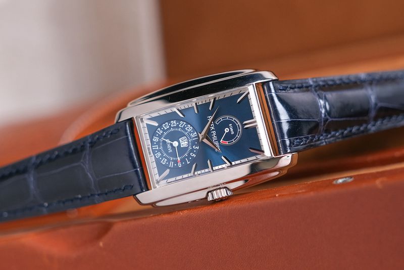 ขนาด 37.4mm. หน้าปัด Blue Dial สีน้ำเงินเล่นแสงสวยงาม มาพร้อมช่องบอกวันและวันที่ ด้านบนเป็นวงเข็ม Power Reserve สำรองพลังงาน 8 วัน หลังเปลือยเห็นกลไกไขลานที่แกะลายและจัดวางมาอย่างสวยงาม วัสดุตัวเรือน 18K White Gold ครับ