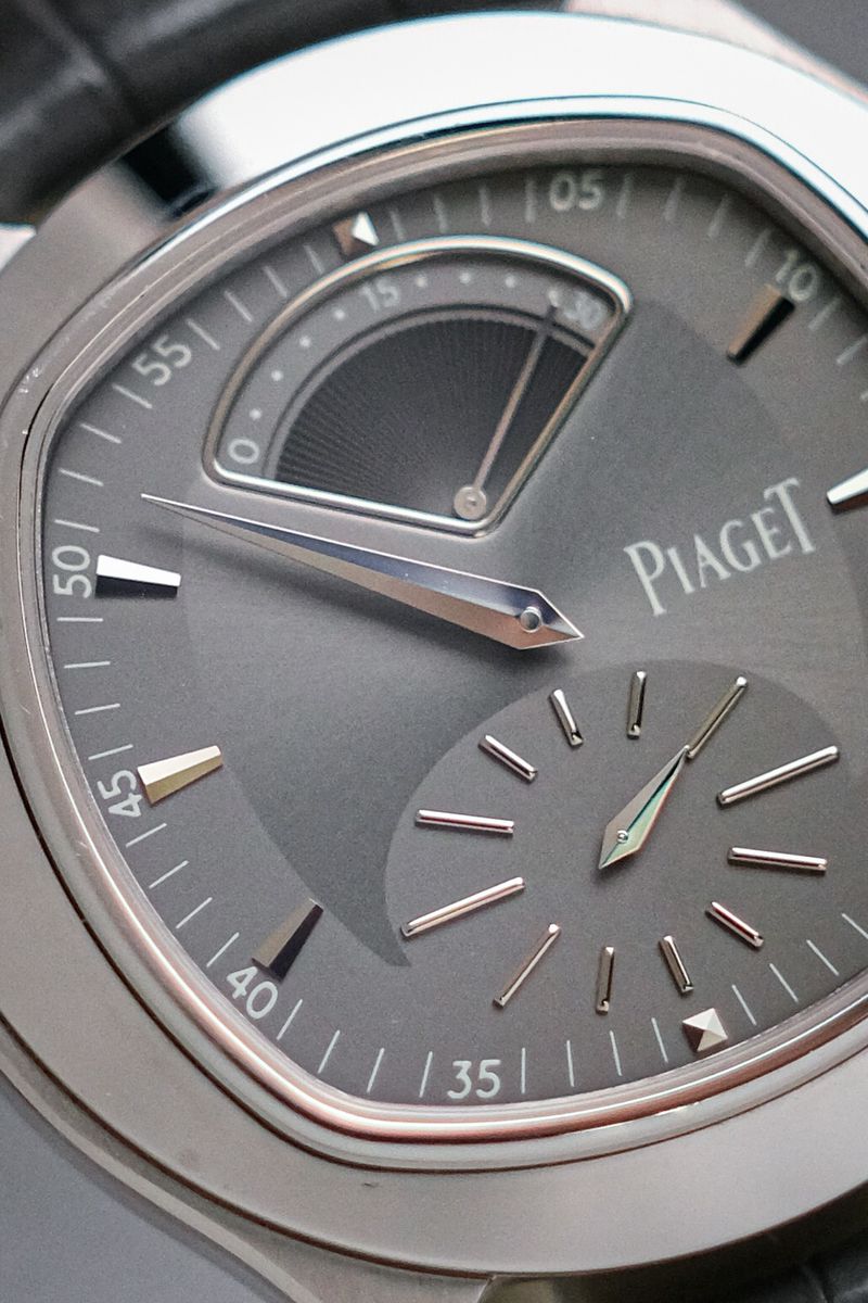 ขนาด 42mm หน้าปัด Grey Sunburst Dial ชุดเข็มทองคำ ด้านล่างบอกชั่วโมง ด้านบนเข็มวินาทีเดินแบบ Retrograde เข็มยาวบอกนาทีกลางหน้าปัด ตัวเรือนทรงเอกลักษณ์ วัสดุทองคำ 18K White Gold หลังเปลือยเห็นกลไกไขลานสวยงามมากๆ