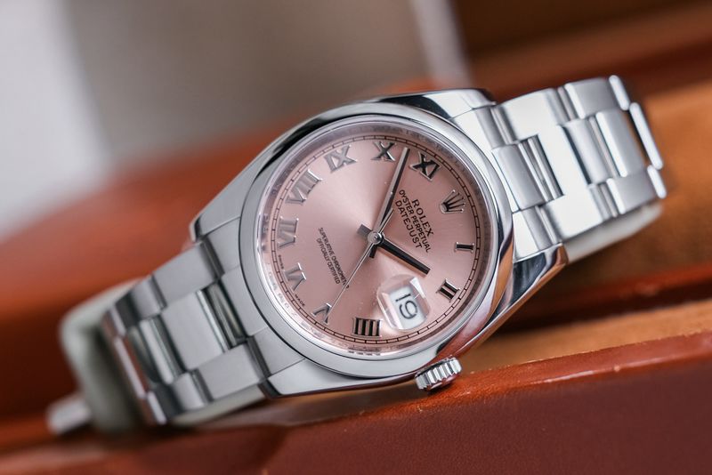 ขนาด 36 มม. หน้าปัดสีชมพู Pink Dial ตัวเลขโรมันสุดคลาสสิก ใส่สวยมากๆ ดูสุภาพและหวานกำลังดี มาพร้อมฟังก์ชันวันที่ที่ตำแหน่ง 3 นาฬิกา และกระจก Cyclops ตามเอกลักษณ์ของ Rolex ตัวเรือนและสาย Oystersteel ทั้งเรือน รุ่นนี้เหมาะทั้งสายสะสมและสายใช้งานประจำวัน ใส่ได้ทุกโอกาส และสีชมพูโรมันถือว่าเป็นลุคที่หายากและนิยมมากครับ