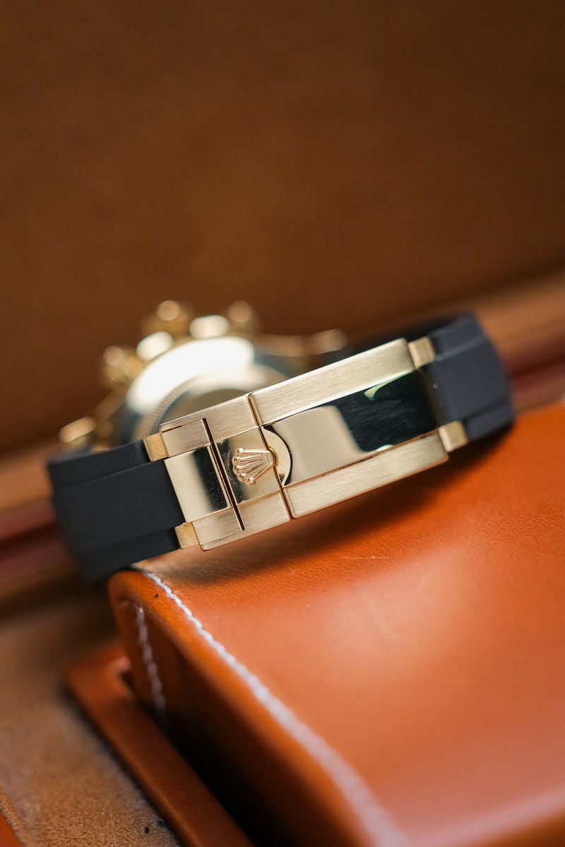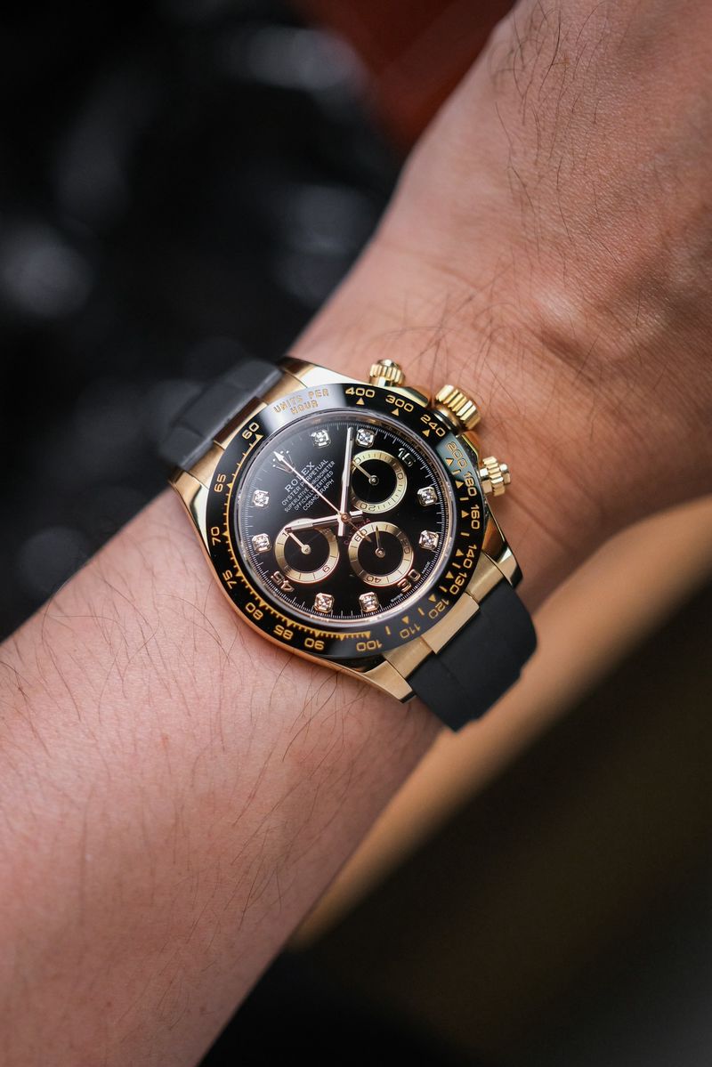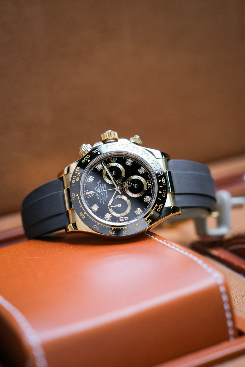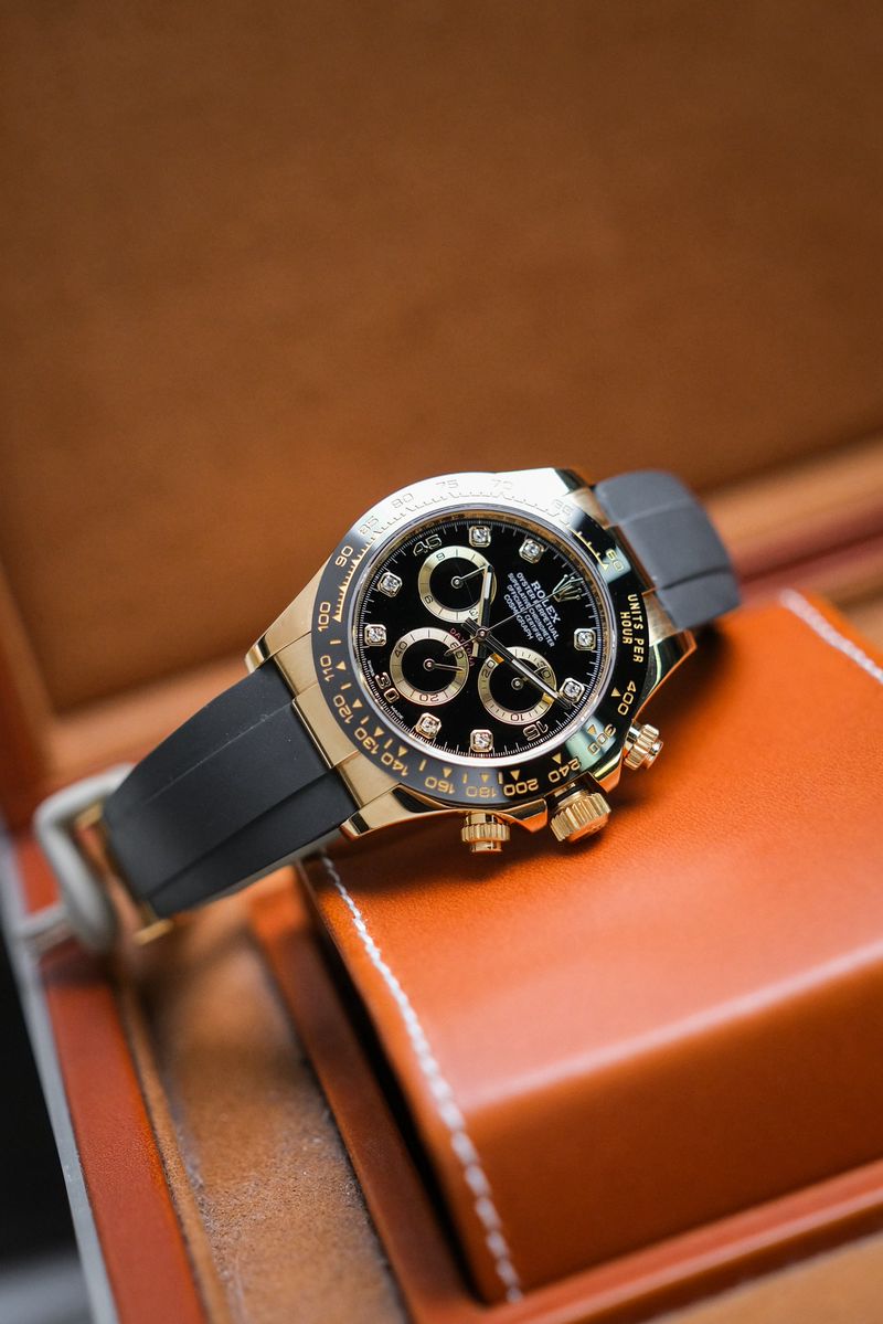 ขนาด 40 มม. หน้าปัด Black Dial หลักเพชร ตัวเรือนยังได้เป็น Yellow Gold 18K เงางาม ขอบสวยงามเลขลึกไม่มีลอกใส่กับสายยาง Oyster Flex บัคเคิลบานพับทองคำตรงรุ่น เดินดีตรวจเช็คเรียบร้อยจับเวลานุ่มมือมากๆครับ