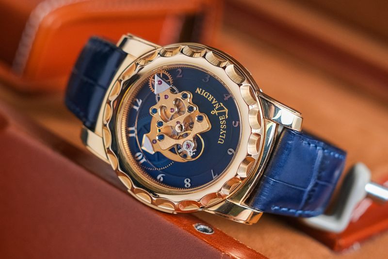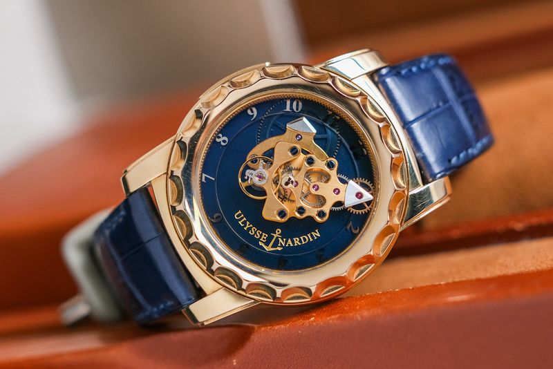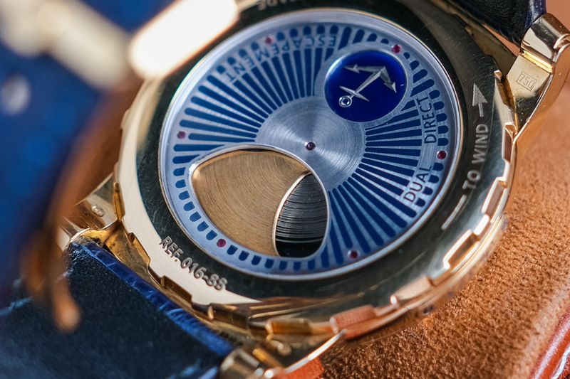 ขนาด 42 มม. หน้าปัด Blue Dial ชุดเข็มใหญ่ ดีไซน์แปลกตา ปรับเวลาโดยการหมุนขอบเบเซิล ตัวเรือนใหญ่สวย วัสดุทองคำ 18K Rose Gold หนักๆตันๆ ด้านหลังโชว์เครื่องไขลาน หมุนไขลานด้วยการหมุนฝาหลัง