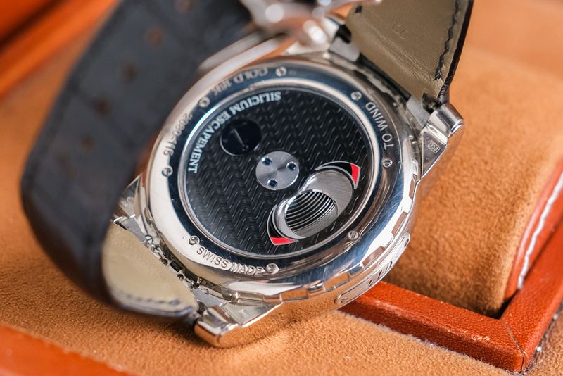 ขนาด 44.5 มม. หน้าปัด Black Dial สีดำตัดแดงสวยงาม ชุดเข็มใหญ่ ดีไซน์แปลกตา ปรับเวลาโดยการหมุนขอบเบเซิล ตัวเรือนใหญ่สวย วัสดุทองคำ 18K White Gold หนักๆตันๆ ด้านหลังโชว์เครื่องไขลาน หมุนไขลานด้วยการหมุนฝาหลัง