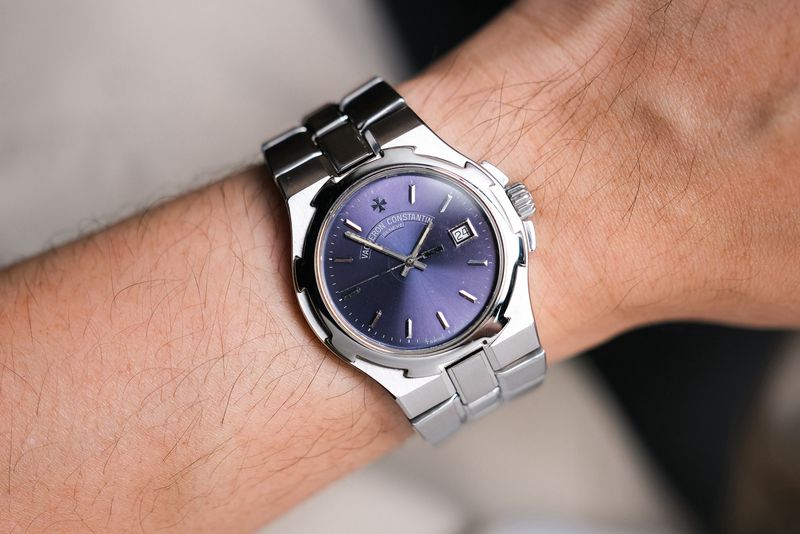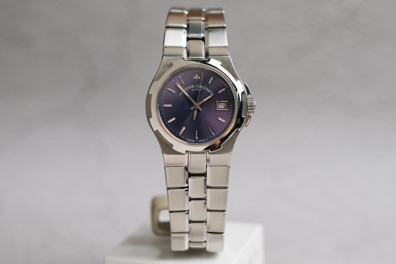 ขนาด 37mm หน้าปัดสีน้ำเงิน เฟดจนเป็นสีม่วง หายากครับ มีช่องวันที่ ตัวเรือน Steel ขอบทรงเอกลักษณ์เฉพาะ Overseas เครื่อง Quartz เดินดี ใส่สวยมากๆ
