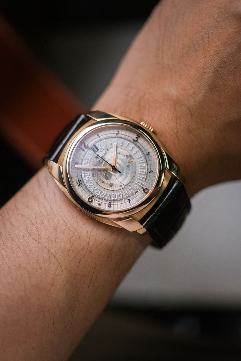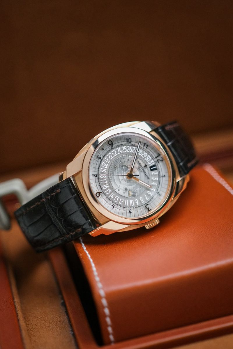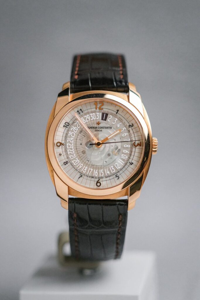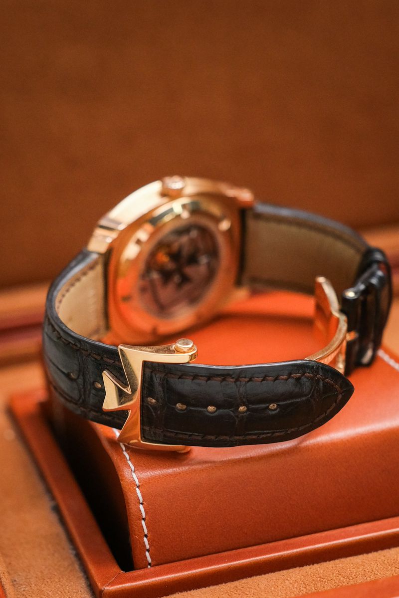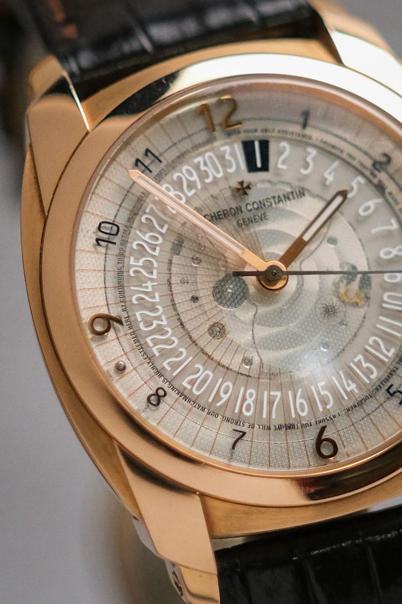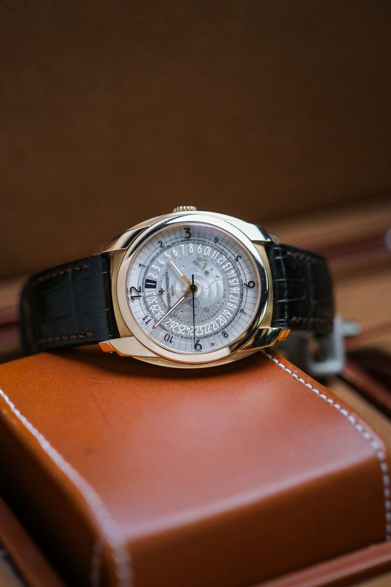 เรือนที่สะท้อน DNA ของ Vacheron Constantin ได้อย่างมีเอกลักษณ์ที่สุด กับดีไซน์ modern haute horlogerie ที่แตกต่างจาก dress watch ทั่วไป ตัวเรือน 18K Rose Gold ขนาด 41mm ทรง cushion ผสานความคลาสสิกกับความร่วมสมัยอย่างลงตัว ไฮไลท์อยู่ที่หน้าปัด sapphire กึ่งโปร่งใส พร้อมลวดลาย micro-text และระบบวันที่แบบ disc ที่ไม่เหมือนใคร